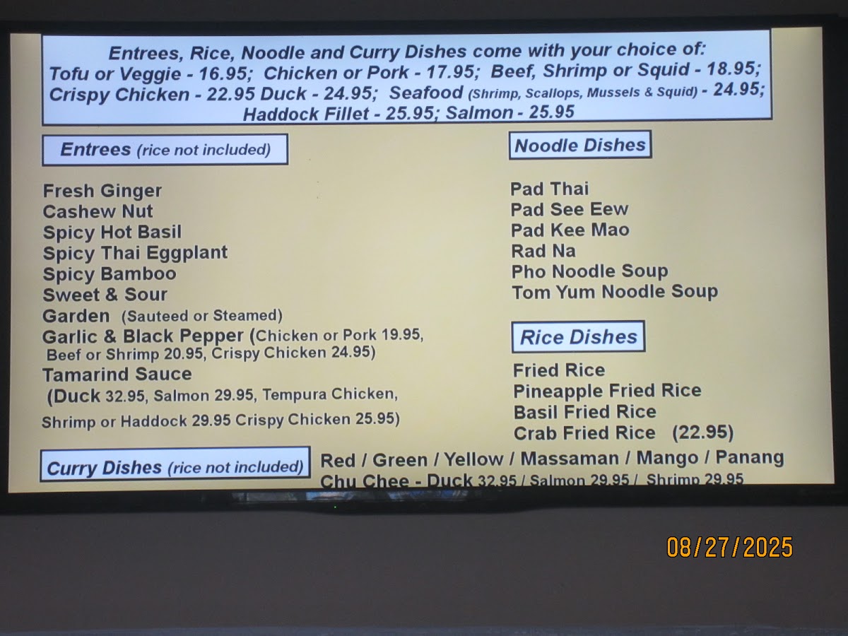 You’ll find familiar favorites alongside vibrant, aromatic dishes like Tom Yum soup, Red and Yellow Curries, and the ever-popular Chicken Pad Thai. Light bites such as spring rolls, steamed dumplings, and crab rolls fit well as starters or casual snacks, while larger plates like Massaman curry or Pineapple Fried Rice provide satisfying, flavorful meals.